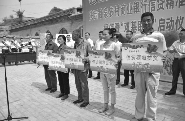 陕西甘泉农村商业银行积极响应省联社“助力脱贫攻坚,信合一马当先”的精准扶贫工作理念,全力支持县域农业产业建设工作,以石门支行为示范点在所辖范围内全面推开小额信贷精准扶贫工作。2016年7月6日,在石门镇封家湾村委会院内隆重举办了信贷精准扶贫现场授信暨“双基联动”启动仪式现场会。甘泉县人民政府副县长杨宝钧、副县长刘向东出席了本次会议,同时邀请各乡镇长、街道办主任,县财政、农业、扶贫、就业等有关部门负责人及石门镇村民等100多人参加了现场会。