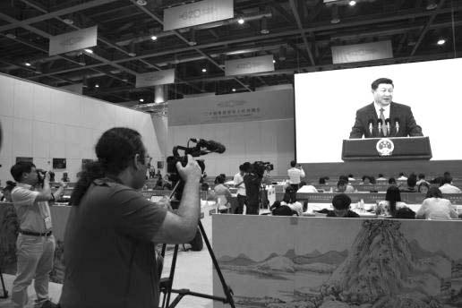 1.5万平方米总面积,以蔚蓝色为基调的公共工作区设置了1500个座位、500台中英文双语操作系统台式电脑,尽头安装着LED大屏幕。G20峰会期间,约70个国家的5000多名记者在这里将峰会的最新资讯传播至全世界。