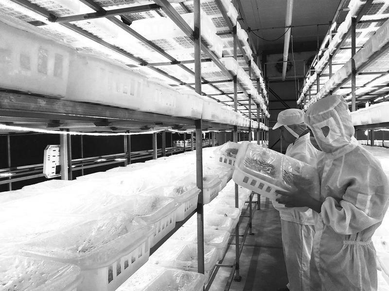 日前,汉中三道中瑞生态农业科技公司与中科院、陕西理工大学等科研机构研发的食用菌粮转换技术在城固获得应用生产,该技术利用小麦、玉米等开发有机食用菌,为国内首创,年产菌粮7000吨,产值逾6000万元,吸纳当地就业60多人。图为工人在真菌培育室查看菌体长势。