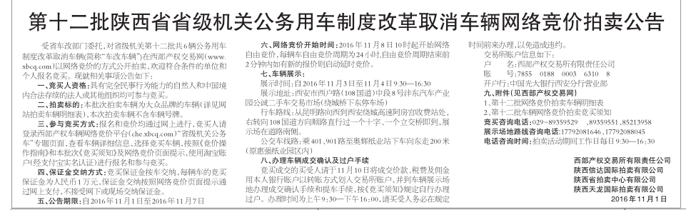 第十二批陕西省省级机关公务用车制度改革取消车辆网络竞价拍卖公告