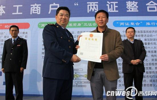 当日,陕西省工商局在西咸新区工商局沣东新城分局西兰路工商所举办陕西首张个体工商户“两证整合”营业执照发放仪式,标志着陕西省个体工商户“两证整合”登记制度改革工作正式开启。