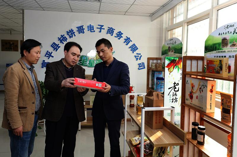 富平县商务局局长索保强(中)深入柿饼哥电子商务有限公司检查指导工作。
