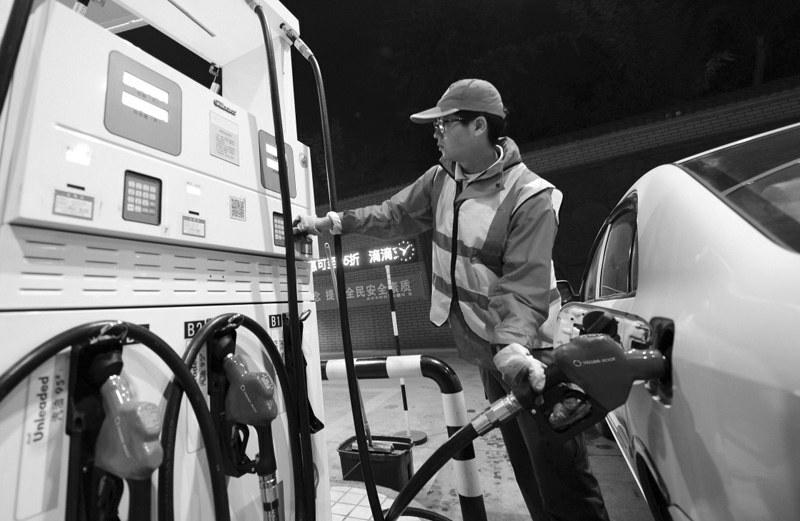 11月16日,陕西省西安市一家加油站的工作人员为车辆加油。当日,国家发展改革委宣布,根据近期国际市场油价变化情况,按照现行成品油价格形成机制,自2016年11月16日24时起,国内汽、柴油价格每吨分别降低365元和355元。
