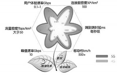 性能和效率需求共同定义了5G的关键能力,犹如一株绽放的鲜花。红花与绿叶相辅相成,其中花瓣代表了5G的六大性能指标,体现了5G满足未来多样化业务与场景需求的能力,而花瓣顶点代表了相应指标的最大值;绿叶则代表三个效率指标,是实现5G可持续发展的基本保障。