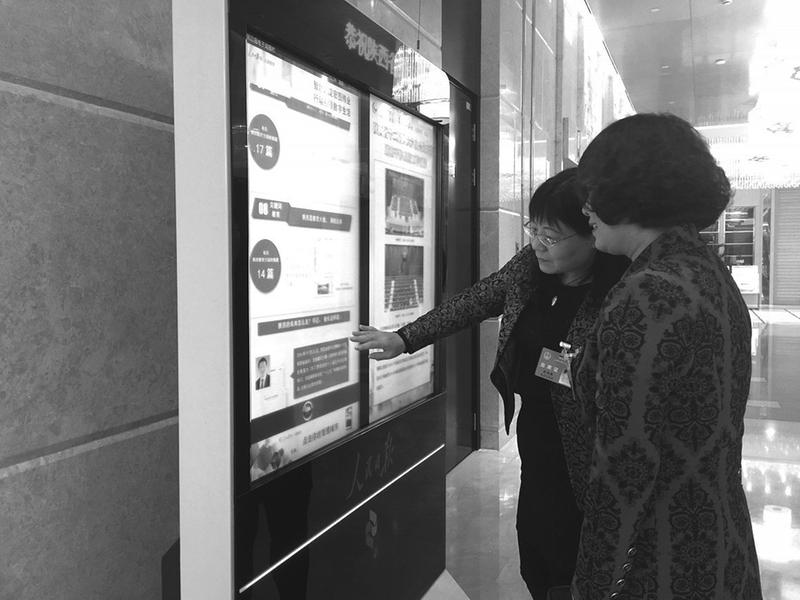 1月16日中午,陕西大会堂一楼两位人大代表站在电子屏面前热烈讨论着十二届人大六次会议开幕以来代表们对政府工作报告的审议内容。