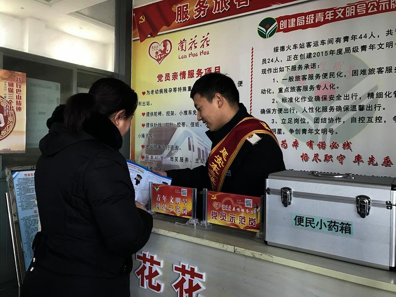 在服务方面该站依托“兰花花”党内服务品牌,在候车室入口设立“兰花花”亲情服务台、售票厅设置咨询台,秉承“一般旅客便民服务、困难旅客主动服务、重点旅客专人服务”的服务特色,为旅客提供使用轮椅、担架、针线、胶带、纸笔等便民温馨服务,为老弱病残孕特殊重点旅客开通绿色通道优先进站重点照顾,通过前台兰花花“爱心卡”为春运停售站台票后确需接送站的旅客提供接送站便利,通过“兰花花”助行爱基金为临时无法自助的受困旅客提供出行帮助,通过铁路12306铁路客服提供预约服务,为旅客提供“平安、有序、温馨”的良好出行体验。
