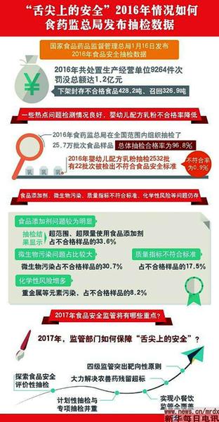 一些热点问题检测情况良好,婴幼儿配方乳粉不合格率降低 据食药监总局副局长郭文奇介绍,2016年食药监总局在全国范围内组织抽检了25.7万批次食品样品,总体抽检合格率为96.8%,与2015年持平,比2014年提高2.1个百分点。抽检结果显示,当前我国食品安全形势总体平稳。