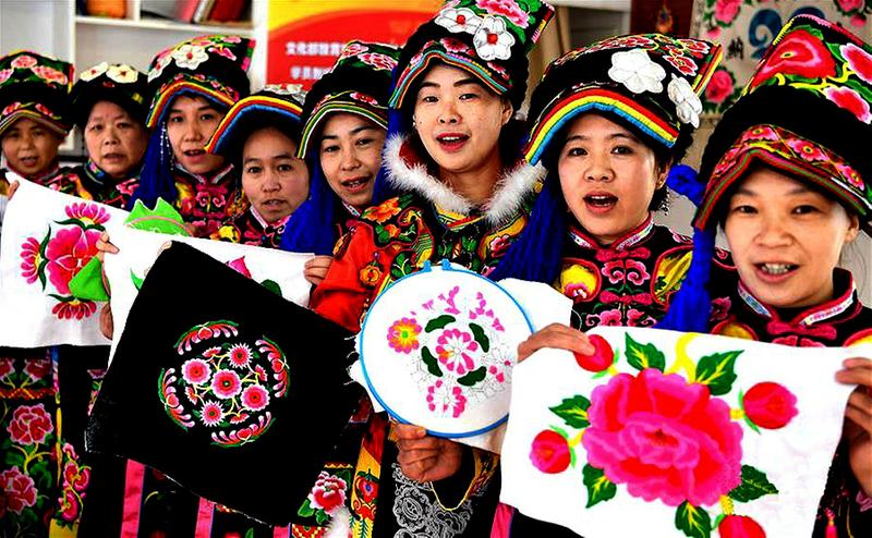 宁强羌绣传承人王小琴以“传承一门技艺、带富一方群众”为己任,带动全县8个乡镇设立羌绣专业合作社,培训出600多名“绣娘”,让她们在参与羌族刺绣的传承与保护中,用自己的双手绣出新生活,脱贫致富奔小康。图为宁强羌绣传承人王小琴(右三)和羌绣合作社的“绣娘”们展示她们创作的羌绣产品。
