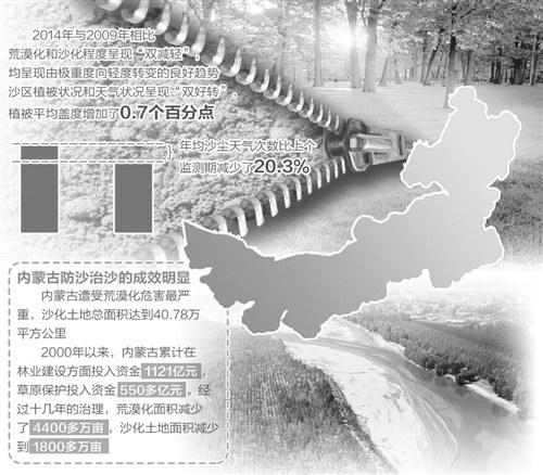 日前,国务院新闻办举行新闻发布会介绍中国荒漠化防治有关情况。林业局副局长张永利在发布会上表示,近年来我国采取一系列重大举措推进荒漠化防治,取得了巨大成效。监测结果显示,2014年与2009年相比,全国荒漠化和沙化面积分别减少12120平方公里和9902平方公里;荒漠化和沙化程度均呈现由极重度向轻度转变的良好趋势,中国荒漠化防治处于世界领先地位,为根治荒漠化开出了“中国药方”。