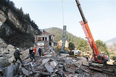 记者了解到,事发现场的悬崖上还有300多立方米的危岩体,裂缝在继续扩大并伴有声响,有可能发生次生灾害。当地正紧急启动新方案,准备对危岩体进行解体,以确保灾难现场下一步清理工作的安全。新华1月21日,救援人员在湖北南漳县海市蜃楼酒店坍塌事故现场救援。
