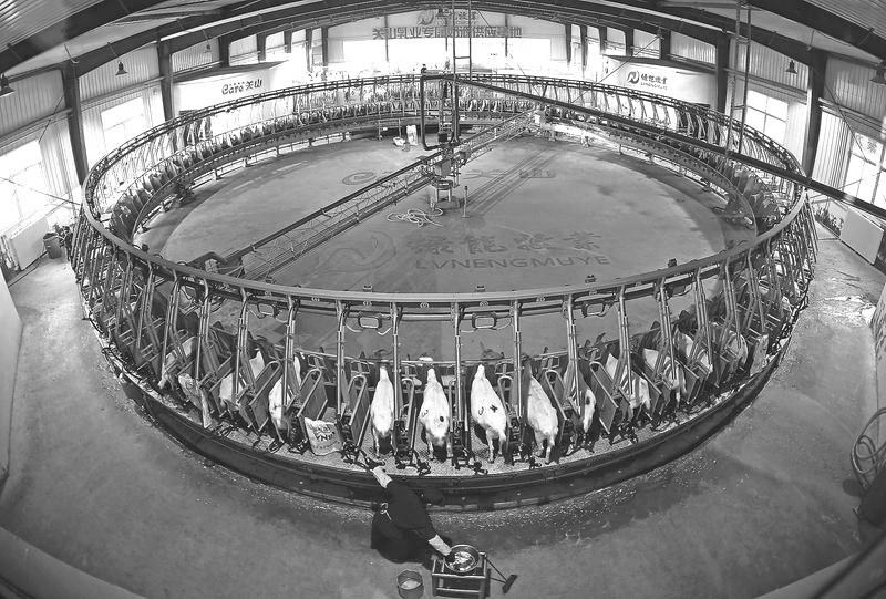 陇县东南镇绿能牧业奶山羊养殖基地,近100头奶山羊正在转盘式挤奶机上自动挤奶。据悉,作为亚洲首个使用羊用转盘式挤奶机的奶山羊养殖基地,该基地通过实施合同托养、协议收贮饲草等方式,有效带动了周边群众脱贫增收。