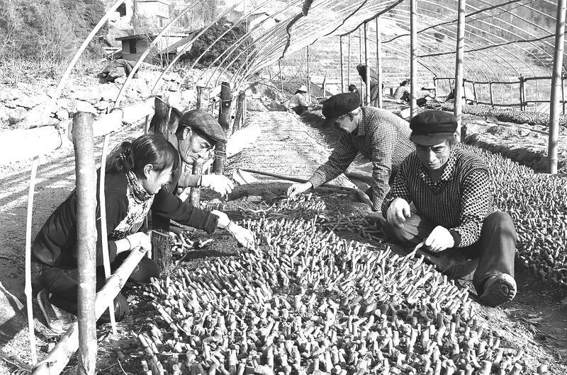 2月16日,在安康市岚皋县南宫山镇桂花村二组,农户们正在金兴葛业有限公司葛根育苗基地务工。据了解,该公司是去年3月桂花村支部招商引资的民营企业,企业入村后,组建农民专业合作社,建葛根园1230余亩,绑定贫困户53户。一年来,共计给农户兑付土地流转费32万元,支付劳务工资96万元,带动16户贫困户脱贫。