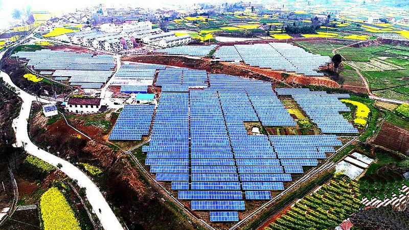 在光伏扶贫园区,一排排崭新的蓝色太阳能光伏发电板闪闪发光,一根根电缆汇聚一起,源源不断地将电流汇入电网……