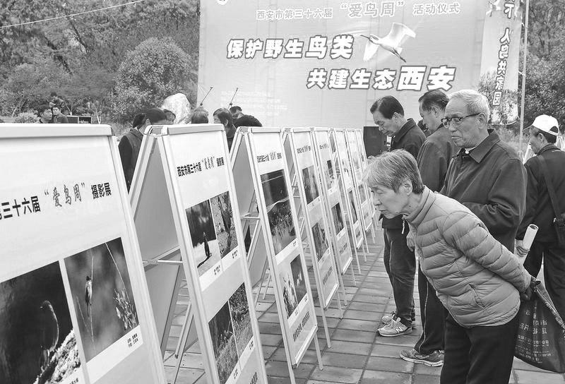 4月11日,西安市农林业委员会、市野生动植物保护管理站举办西安市第36届“爱鸟周”宣传活动。活动以“保护野生鸟类,共建生态西安”为主题,通过科普宣传,促进人们认识大自然、亲近大自然,增强全社会生态保护意识,促进人与自然的和谐发展。图为500余幅优秀鸟类摄影作品供市民观览。