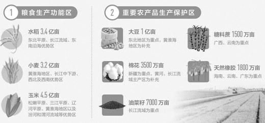 韩长赋分析,加上“两区”之外产能,按发挥比较优势、优化种植结构、稳定农民收益的思路,目前测算划定的重要农产品生产保护区,可确保现有供给水平不降低。其中,大豆保护区1亿亩、油菜籽保护区7000万亩、棉花保护区3500万亩、糖料蔗保护区1500万亩。