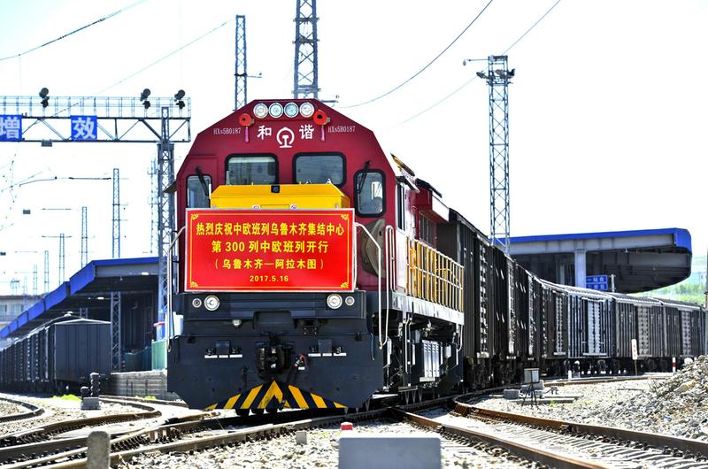 5月16日,满载着水暖建材等货物的X9081次列车从中欧(中亚)班列乌鲁木齐集结中心出发,驶往哈萨克斯坦阿拉木图,这是中欧(中亚)班列乌鲁木齐集结中心自2016年5月26日投入运行后开行的第300趟国际货运班列。图为当日,X9081次列车从中欧(中亚)班列乌鲁木齐集结中心缓缓驶出。