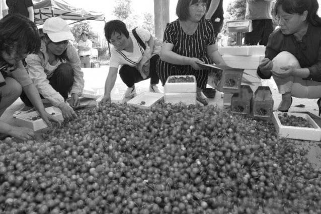 集贤镇村干部帮助果农将采摘的樱桃装箱集贤镇村干部帮助果农将采摘的樱桃装箱