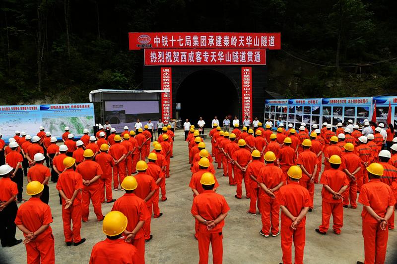 天华山隧道贯通仪式现场 “一线穿南北,天堑变通途”。当建设者们凿穿秦岭,大桥横亘南北,巨龙飞越天堑,他们成为西成高铁建设的一幕幕缩影,共同筑造了入蜀新道。西成高铁是国家中长期铁路网规划中重点客运专线项目,建成通车后西安至成都的列车运行时间将缩短至3小时,届时,陕川两省将形成一日经济圈,对促进关天—成渝两大经济区交流合作和完善区域快速客运专线路网建设都具有重要意义。参与全线重难点标段施工的中铁十七局二公司西成项目部自2012年12月上场以来,众志成城,攻坚克难,在秦岭深处默默鏖战了四年多,目前各专业工程已完成静态验收,联调联试已正式启动,为实现西成高铁的早日通车奠定了坚实基础。