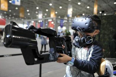近日,中国国际大数据产业博览会展馆在贵阳国际会展中心开馆,300余家来自全球的大数据企业参展,展示大数据方面的最新科技成果及应用。博览会上,小i机器人,最新的VR、AR穿戴体验设备,高科技的脸部识别技术等“黑科技”大放异彩。图为参观者在中国国际大数据产业博览会体验虚拟现实(VR)体感游戏。