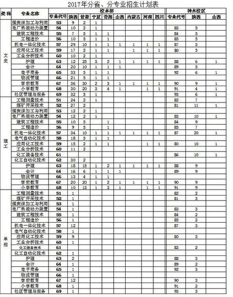 文史类:机电一体化技术、电厂热能动力装置、建筑工程技术、工程造价、应用化工技术、工业分析技术、煤炭深加工与利用、物流管理、会计、学前教育、小学教育、护理、电子商务、社区管理与服务。