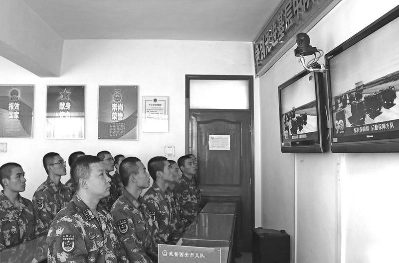 7月30日,武警西安市支队第九中队组织官兵收看庆祝中国人民解放军建军九十周年阅兵的电视直播。
