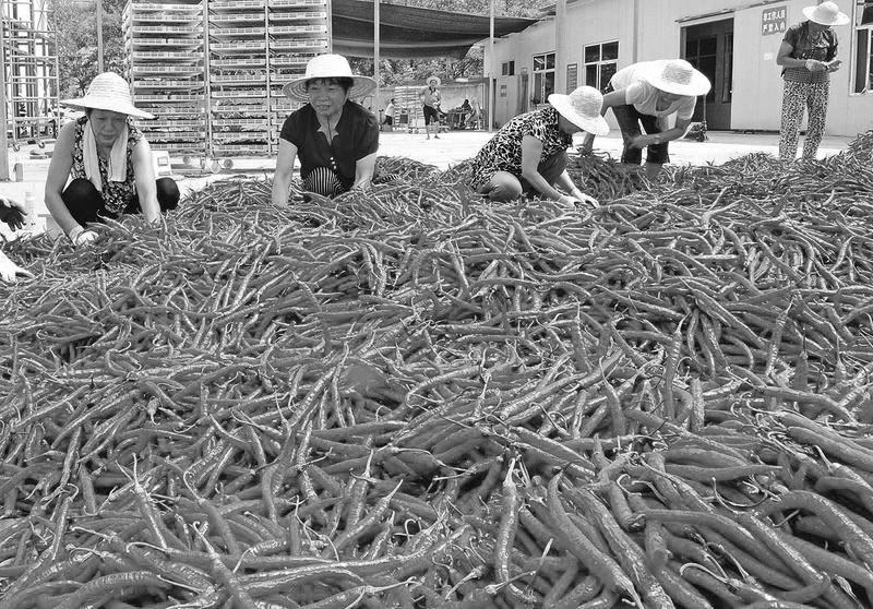 陕西省石泉县运用“支部+基地+贫困户”党建促脱贫模式,鼓励企业与村产业发展合作社签定合同,为其提供种子、肥料、饲料,免费进行技术指导,并按合同价回收产品,带动全县辣椒订单种植6320亩,企业辣椒酱年销售产值达9000万元。图为工厂工人们正在挑选回收的新鲜辣椒。