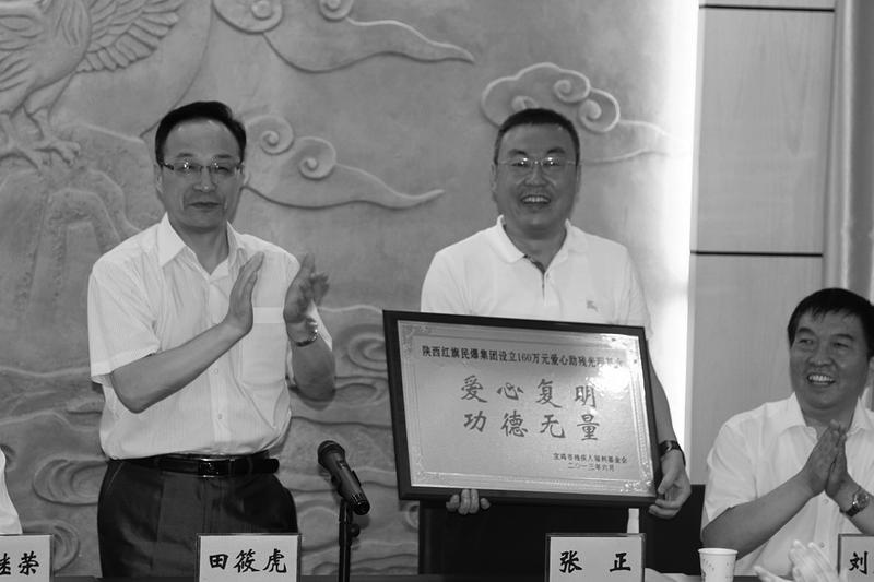 大义行四海,大爱播九州。红旗民爆集团董事长、总经理张正富于爱心,他积极倡导并履行企业社会责任。企业出资50万元,在凤翔中学设立红旗爱心助学教育基金,100多名家庭困难学生受到资助。2013年,在市残疾人福利基金会设立“红旗民爆复明基金”,每年捐息8万元,帮助100位贫困白内障患者免费做复明手术。5年来,使500名农村贫困白内障患者重见蓝天白云。