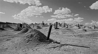 冷湖的日照率超过80%,是亚洲日照最多的地方,在全世界排名第三。烈日下的墓地整个泛着白光,原先的木头墓碑倒在地上,坟墓前竖起了新的石碑,被沙土半埋起来的花圈只剩了几圈环形铁丝。每年清明,冷湖行政委员会都会组织公祭,让冷湖柴达木精神流传下去。