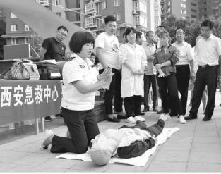 9月20日,西安市“无烟家庭”进社区宣传教育实践活动在红专南路社区文化广场举行,来自10余家医疗卫生单位的近百名志愿者为群众进行义诊和戒烟咨询。图为西安急救中心医护人员为社区居民开展心肺复苏实操技能培训。