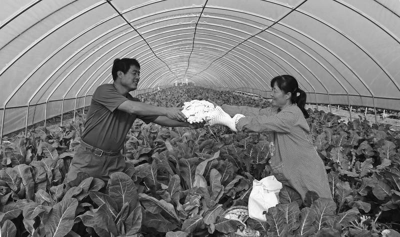 11月8日,位于蓝田县孟村镇李华村的水安路扶贫产业带200多亩蔬菜大棚里,来自西安市临潼区的赵三利、张秀丽夫妇在收获松花菜。这些无公害、品质好的松花菜,远销四川、重庆等地。