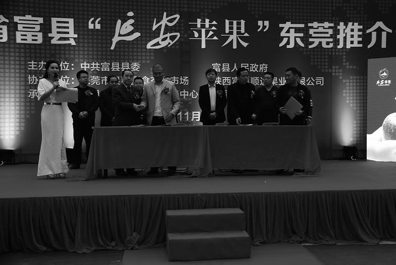 与此同时,富县人民政府与东莞市果菜副食交易市场有限公司签订富县“延安苹果”购销推广战略合作协议;陕西省富县顺达果业有限责任公司与东莞市宾香果品有限责任公司签订10000吨富县“延安苹果”购销合同,签约金额8000万元。