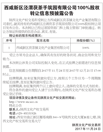 西咸新区泾渭茯茶手筑园有限公司100%股权转让信息预披露公告