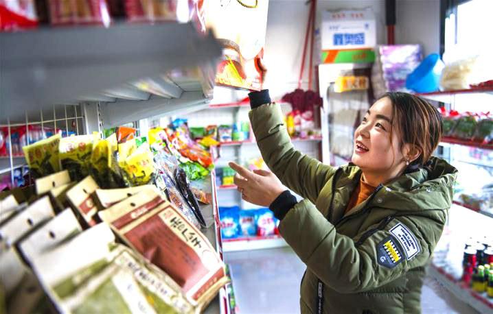地处秦巴深山的陕西省宁强县是陕南移民搬迁安置重点县,从2015年10月开始兴建筒车河移民安置社区。社区依托循环经济产业园区以及周边规划建设的现代农业园区、西成高铁车站,解决了搬迁群众就业及周边企业的用工问题。图为12月10日,在宁强县筒车河移民安置社区,从高寨子街道办大安沟村搬来的杨雅妮在自己开办的超市上货。
