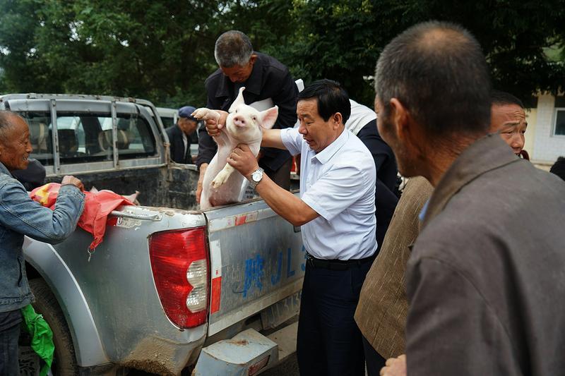 “乡亲们排好队,每户两头猪仔,领完猪崽后再领取猪饲料。希望你们按照我们公司的标准去养殖猪崽,这样能节省费用,加快生猪出栏的速度。”吴起县太宝牧业发展有限责任公司总经理赵兴明在为群众发放猪仔的同时,叮嘱米渠的贫困户们养殖细节。
