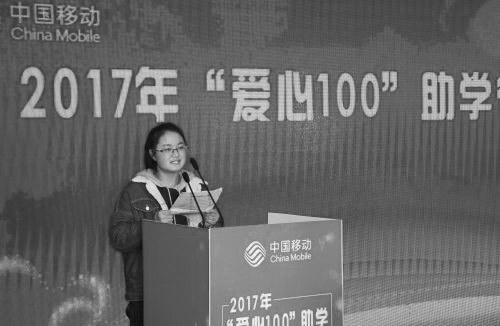受助学生代表缑双发言 本报讯(记者 庞玲玲)中国移动陕西公司联合共青团陕西省委、陕西省教育厅、陕西省青少年发展基金会共同主办的2017年“爱心100”助学行动捐助仪式于近日在西安市周至县举行,这标志着2017年“爱心100”助学行动取得了圆满成功。