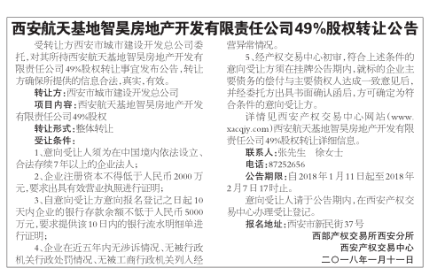 西安航天基地智昊房地产开发有限责任公司49%股权转让公告