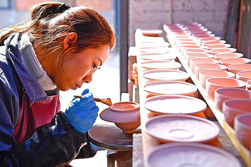 位于渭北高原南麓漆水河流域的耀州窑创烧于唐,鼎盛于宋,是中国古代六大陶瓷名窑之一,也是北方青瓷的代表窑场。“十里窑场,千年炉火”,这里烧制出的耀州瓷曾沿着陆上和海上丝绸之路远销海外。图为在位于耀瓷小镇的铜川市观唐陶瓷有限公司的生产车间内,工作人员徐娜在素烧坯上打蜡。