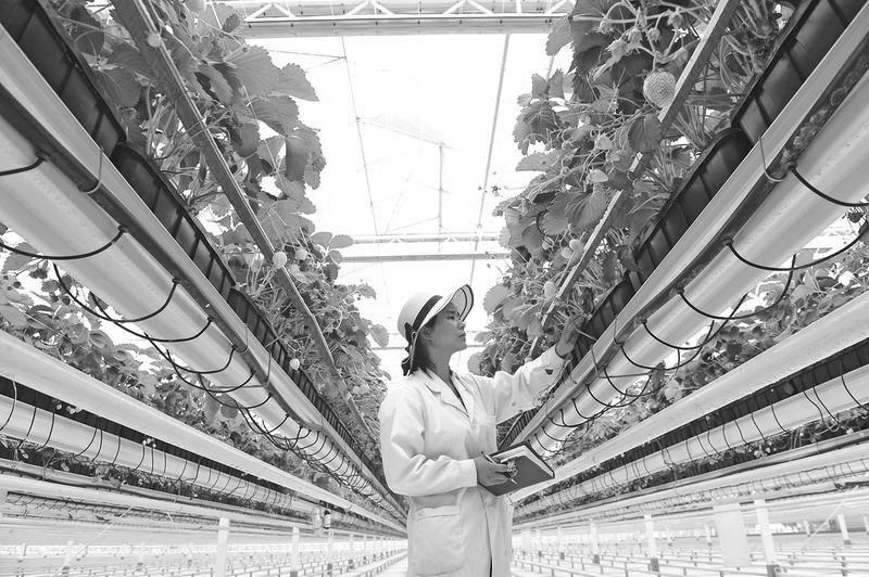 铜川市海升现代农业园用现代化的理念发展现代农业园区,示范带动周边农业产业化发展,实现农业增效、农民增收和企业发展三赢的良好局面。自运营以来,园区已吸纳周边200余名农民入园长期务工。图为技术人员在智能玻璃温室统计草莓花序。