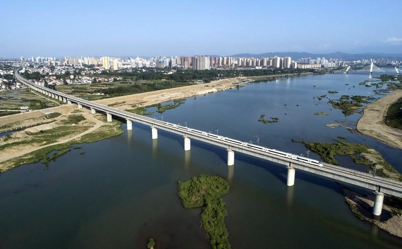 一列动车从汉中市汉江大桥上驶过,汉中跨入高铁时代。