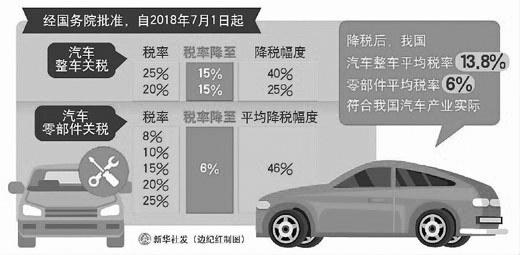 国务院关税税则委员会公告显示,自2018年7月1日起,降低汽车整车及零部件进口关税。汽车整车税率为25%的135个税号(包括9座及以下小型客车、大中型客车、车重5吨及以下的轻型货车)和税率为20%的4个税号(包括车重5吨以上的汽油型货车、车重在5吨至20吨之间的柴油型货车)的税率,将降至15%。汽车零部件税率分别为8%、10%、15%、20%、25%的共79个税号的税率,降至6%。