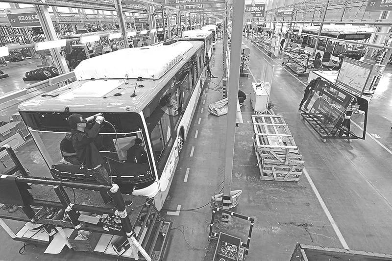 截至6月3日,西安市累计推广比亚迪纯电动公交车达3050辆,占该市公交运行车辆总数的45.5%。据悉,西安市纯电动公交车的投入使用,每年将减少天然气消耗约5850万立方米、减少一氧化碳排放约238.8吨、减少碳氢化合物排放约92.1吨、减少氮氧化合物排放约706.8吨、减少二氧化碳排放约9.4万吨,有效推动了大气污染治理和节能减排。图为工人在西安比亚迪纯电动客车基地总装生产线上安装前挡风玻璃。