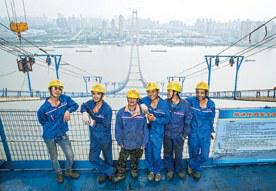 武汉杨泗港长江大桥施工现场在200余米高的“云端”——这是近80名中铁大桥局工人日夜奋战的阵地。他们穿梭在南北两岸的猫道上,对主桥进行主缆架设和引桥承台、墩身、箱梁施工。滚滚长江水的上空,一条优美的“天梯”缓缓铺开。
