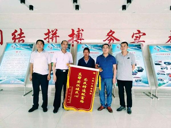 近日,山阳县两岭镇三合村中心组几位村民代表将一面“为民修通致富路,真帮实扶暖民心”的锦旗送到了山阳公路段办公楼院内,感谢山阳公路段领导对他们村的关怀与帮扶。
