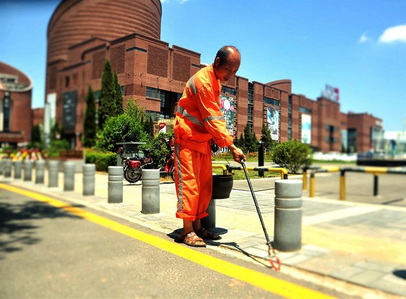 (图②)7月18日中午13点,浐灞一商场门口,一位值班环卫工在捡地上的烟头。据他介绍,每天早上6点到晚上21:30,负责此区段的6位环卫工人必须实现无缝对接,保证随时有人值守,以免烟头或者别的垃圾在地面上长时间停留。