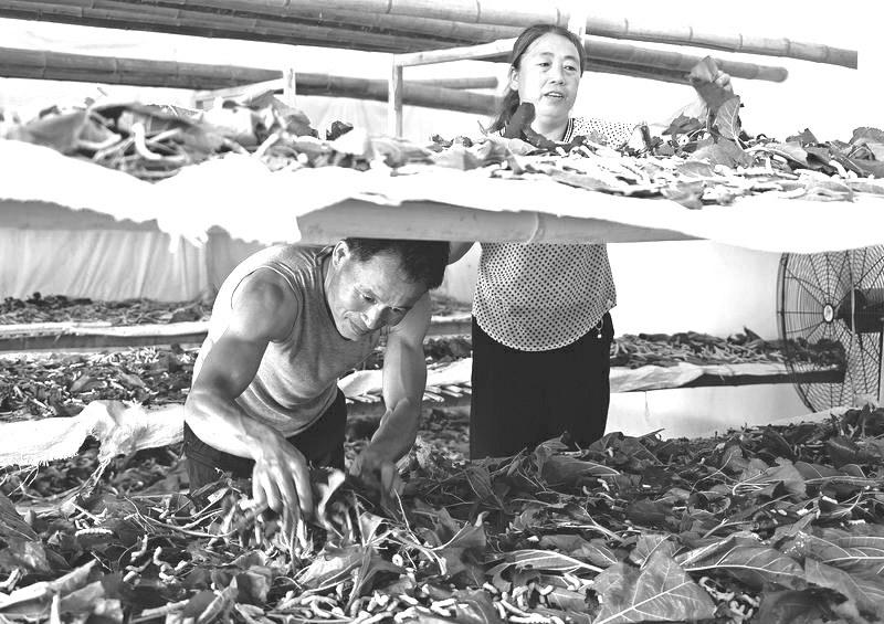 图为石泉县池河镇新兴村蚕农刘小兰与丈夫一起在屋内给大蚕喂桑叶。