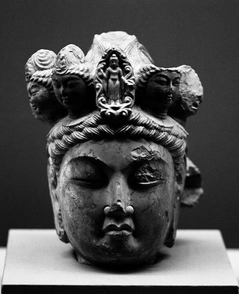 在唐代,有一种在普通观音的头顶上再刻画出多个小观音头像的观音造型,一度流行于世。这种造像形式通常有观音面十一个,故而被称为十一面观音像。保存至今的十一面观音像有壁画、木雕、金铜雕、石雕等,数量并不多,但件件都堪称精品。西安碑林博物馆所藏的这一件残断的汉白玉观音头像,是馆藏造像中唯一一件十一面观音头像,1983年出土于西安市西郊的一所学校,高25.5厘米。