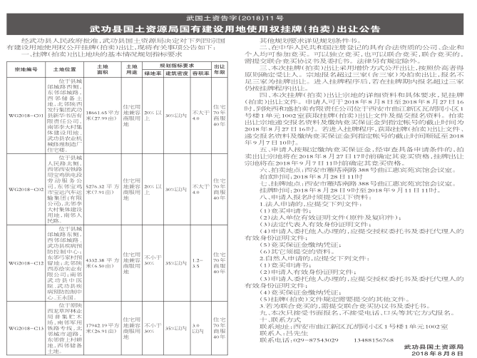 武功县国土资源局国有建设用地使用权挂牌(拍卖)出让公告