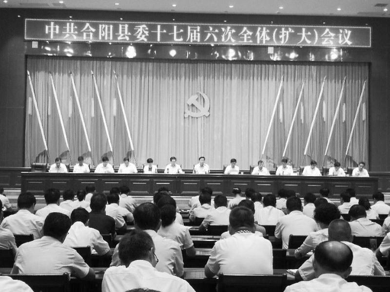 8月7日上午中共合阳县委十七届六次全体(扩大)会议在县体育馆会议中心召开。县委委员、候补委员、县纪委委员、非县委委员的县级领导、县人大、政协各工作委员会负责同志、各镇党委书记、镇长、城关街道办党工委书记、办事处主任、县委和县级国家机关各部门主要负责同志、各人民团体、直属事业机构、派出机构、驻合单位负责同志、部分下属事业单位主要负责人等200余人参加了会议。