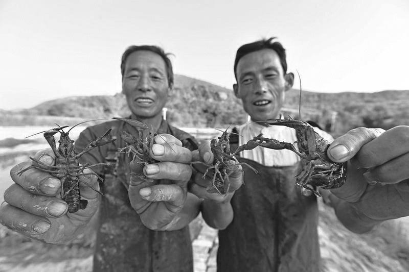8月29日,在黄陵县田庄镇强河村小龙虾养殖示范点,两位村民在展示捕捞的小龙虾。黄陵县渔政监督管理站从去年尝试在田庄镇强河村养殖小龙虾,今年5月,又从湖北引进小龙虾苗种50万尾,分别投放在桥山镇官庄村、隆坊镇三岔口村等村池塘,养殖面积总计100余亩,推进该县经济发展方式转变及产业结构调整,助推黄陵县产业扶贫。