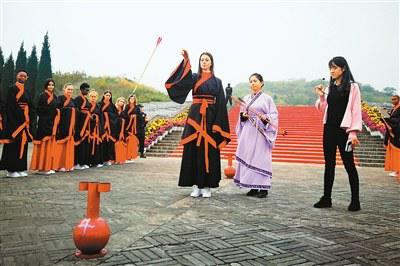 伴随着悠扬典雅的古乐,极具文化特色的汉代茶艺表演吸引了模特们的目光。在氛围庄重的穿汉服、学汉礼课堂,各国模特跟着老师的现场指导,身着汉服学行汉礼,体验中华礼仪的博雅优美。之后,在帝陵广场,模特身着汉服争相参与汉代特色的体育休闲项目——投壶,现场气氛热烈,欢声笑语不断。最后,模特们还参观了汉阳陵地宫。
